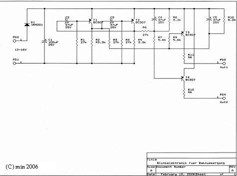 At the beginning something simple to warm up your solder iron, totally without any software - blinking electronic. You may also do it using TTLs, a timer or an Controller. Instead of BC307 BC308, BC309 or BC556-BC559 should work as well. For each side a pair of flashing lights are connected to Out1 and another pair on the other side to Out2. The common pole is PD1. "Revision c" shows different layouts for bulb or LED operation.